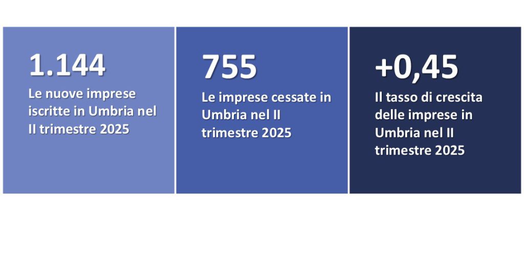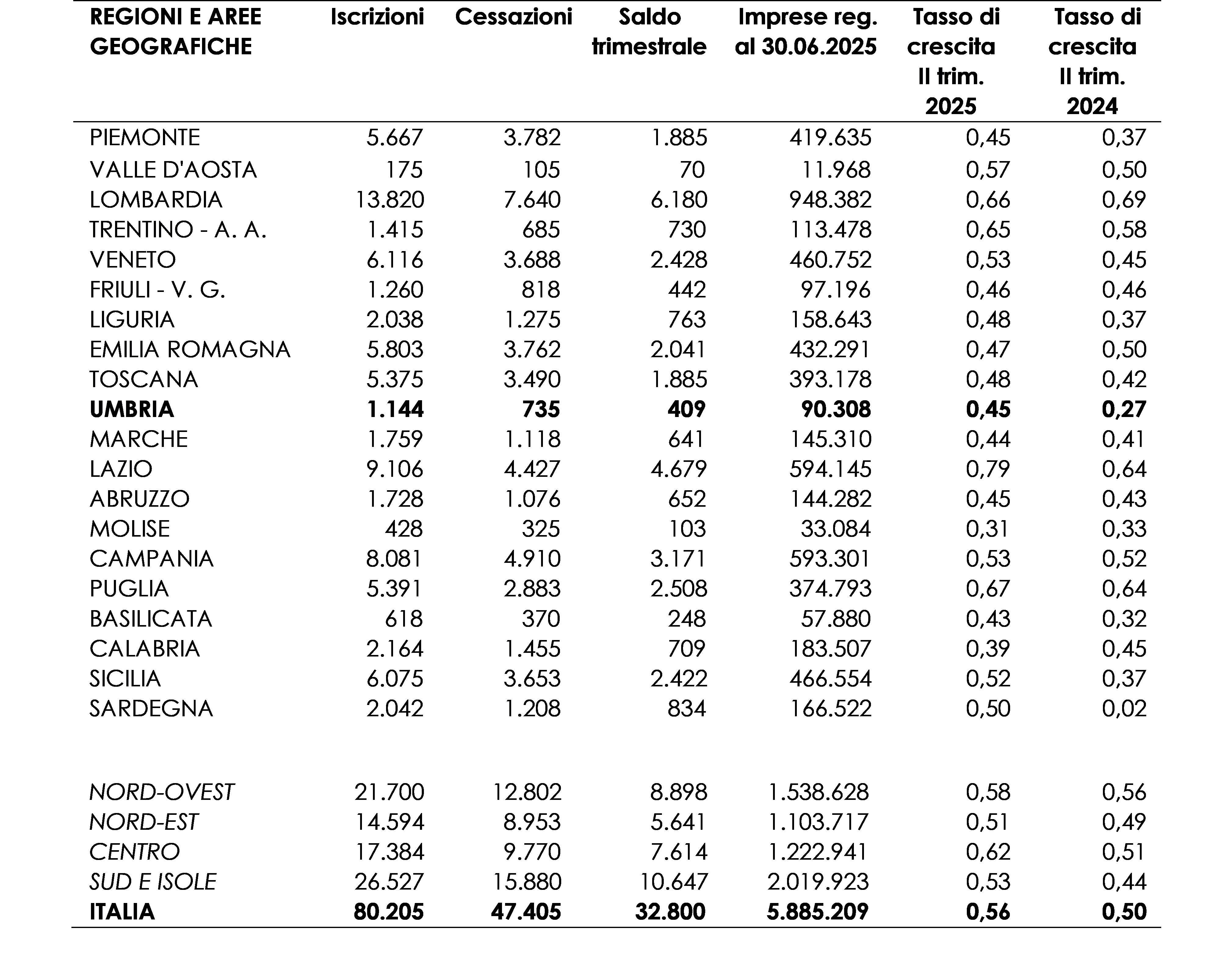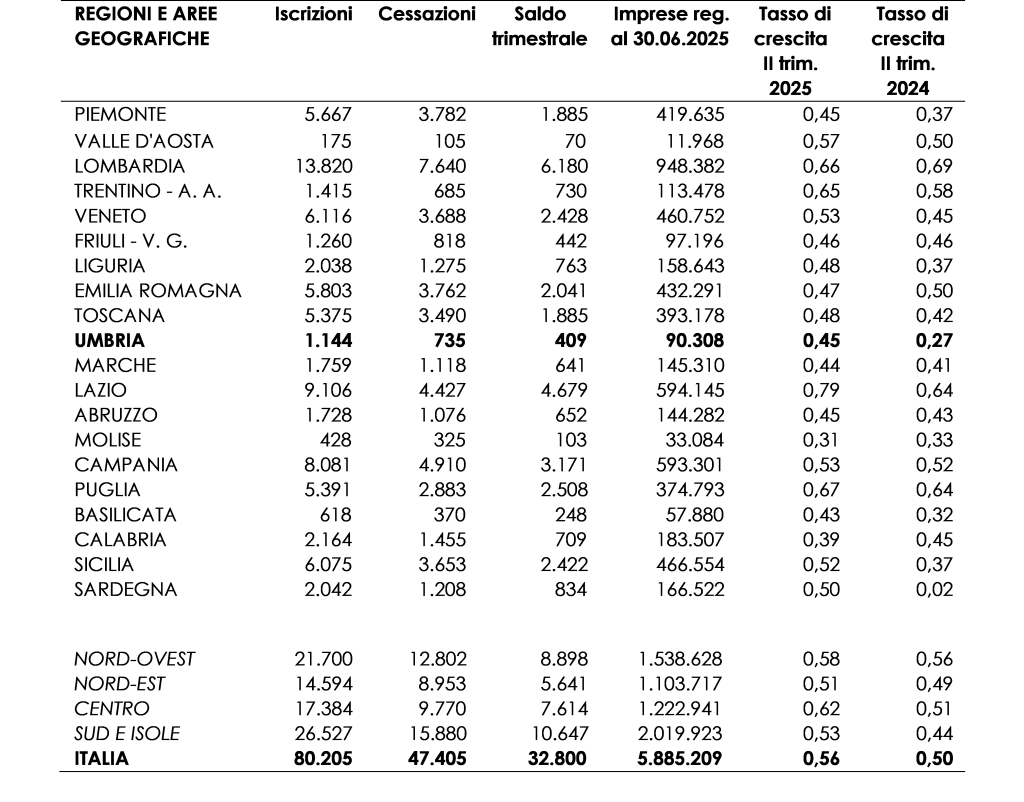 In Umbria le iscrizioni di nuove imprese nel II trimestre 2025 sono state 1.144 a fronte di 735 cessazioni con un saldo positivo di 409 imprese: sia la Provincia di Perugia che di Terni registrano un saldo positivo e pari rispettivamente a +303 e +106 imprese.